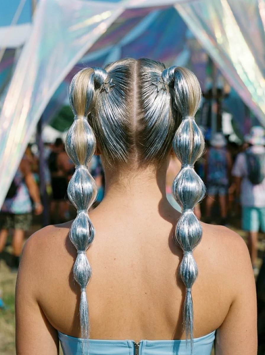 20.Sparkle Space Buns with Holographic Hair Tinsel