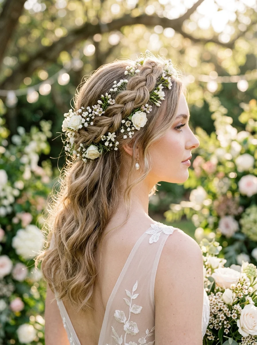 - Finally, I'd tuck in delicate sprigs of baby's breath (or whatever fresh flowers you love!) into the braids and along the waves to really bring this ethereal look to life.
