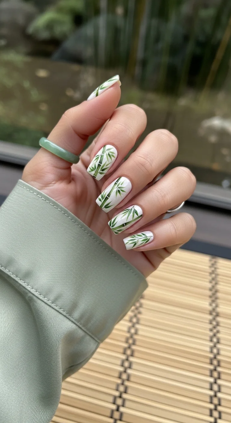 Design Element: Hand-painted green bamboo segments with delicate pointed leaves.