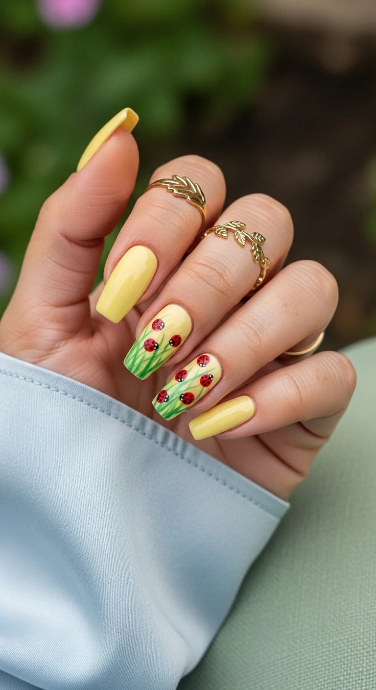 - The Art: On your ring finger, use a thin brush and green polish to draw a delicate leafy vine over the yellow base.