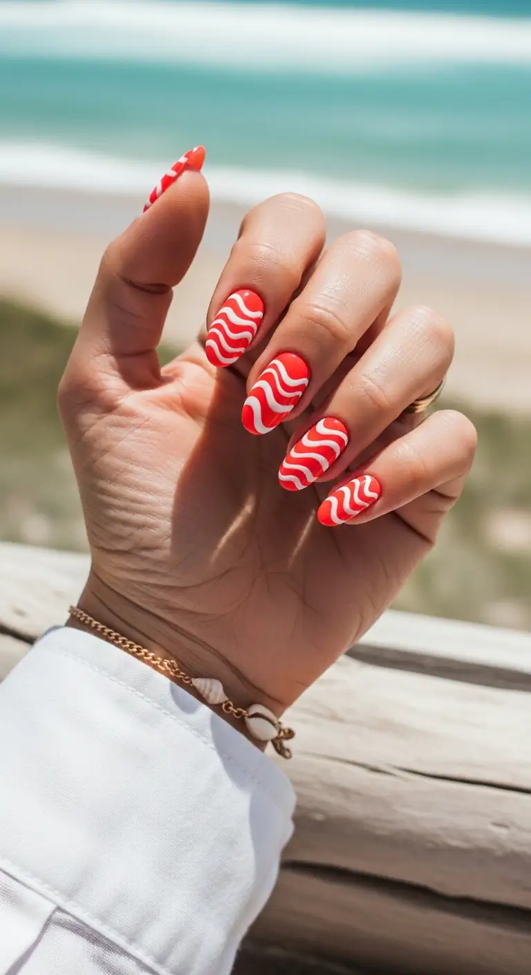 If your vacation mood board is giving 70s poolside glamour, you need to meet your new signature mani. This bright, popping coral red against a crisp white background with these dense abstract waves screams summer energy. It is the ultimate retro beach look, designed to be seen against the bluest ocean or from the deck of a yacht.